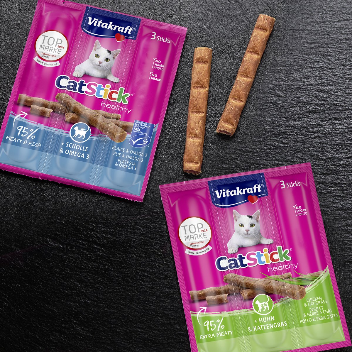 All Vitakraft® Cat Stick® are naturally made without added sugar, cereals or artificial colors and preservatives.