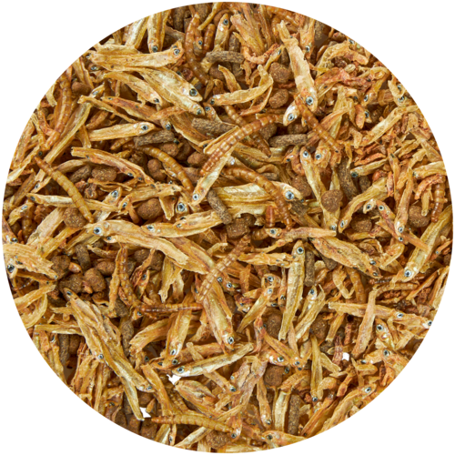poissons et sous-produits de poissons 32,5%, mollusques et crustacés 25,8%, céréales, insectes (ver de farine 8,0%), viandes et sous-produits animaux, sous-produits d'origine végétale, huiles et graisses, extraits de protéines végétales, levures, substances minérales, algues
