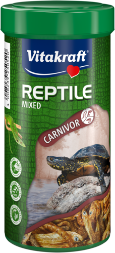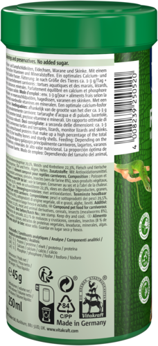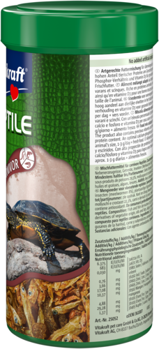 Alimentation de qualité riche en protéines, et plus particulièrement en protéines animales. Mélange spécialement adapté aux tortues aquatiques et tortues des marais carnivores, lézards, varans et scinques. Contient des vitamines et substances minérales essentielles, des petits poissons, différents crustacés et des vers de farine énergétiques. Le rapport calcium/phosphore optimal et la vitamine D3 contribuent à la bonne santé des os et à la solidité de la carapace. Nourriture sans colorants, sans arômes artificiels ni conservateurs