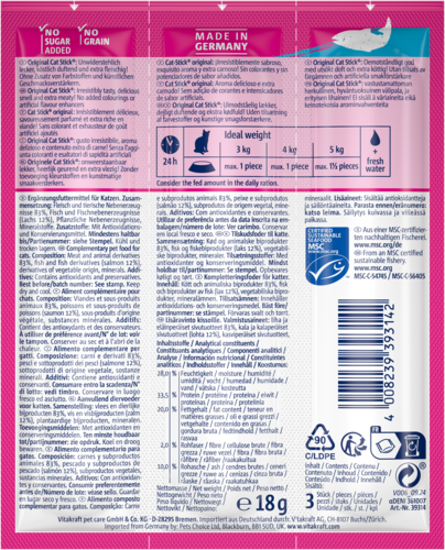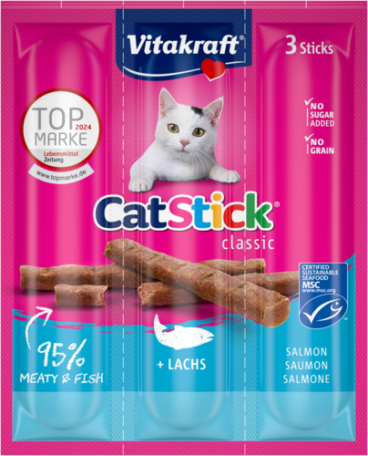 Le Cat Stick Mini au saumon va vous séduire par son excellente qualité, sa teneur en viandes / poissons extrêmement élevée (95%), sa recette sans sucre ainsi que par son goût unique et irrésistible sans colorants ni exhausteurs de goût. Il présente des petites marques de prédécoupage très pratiques pour fractionner plus facilement les bâtonnets en petits morceaux. 3 bâtonnets emballés individuellement pour conserver toute la fraîcheur du produit.