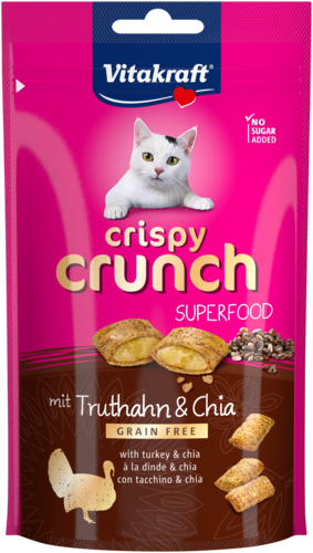 Les Crispy Crunch Superfood à la dinde et aux graines de chia sont de délicieuses petites bouchées croustillantes au coeur crémeux. Les graines de chia sont naturellement riches en acides gras oméga-3 pour une peau saine et un poil brillant. Ce snack ne contient pas de céréales et convient ainsi aussi particulièrement aux animaux qui ont des intolérances alimentaires. Le Crispy Crunch Superfood est fabriqué selon une recette sans sucre.