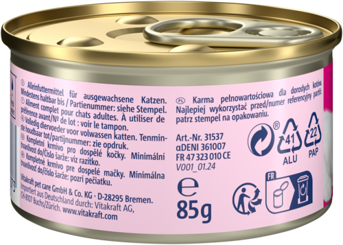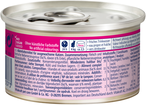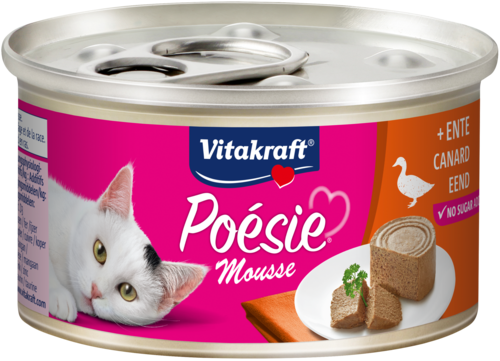 Une mousse légèrement fouettée au canard tendre dans une boîte pratique. Cette nourriture humide complète est adaptée aux besoins nutritionnels des chats adultes et elle est de la plus haute qualité. Poésie Mousse ne contient <strong>AUCUN sucre ajouté, aucune céréale, aucun colorant artificiel ni exhausteur de goût</strong>.