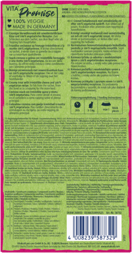 Votre chat vous pique-t-il le fromage et les tomates de votre sandwich ? Avec un tel fan de nature comme votre gros gourmand, Vitakraft est ce qu'il vous faut ! Surprenez votre petit gourmand avec Vita Veggies® : snack pour chats 100 % végétarien Le snack est enrichi en taurine, connue pour soutenir les fonctions oculaires et cardiaques du chat.