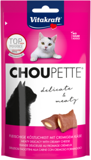 Vitakraft® CHOUPETTE® surprend votre tigre d'appartement morceau par morceau avec une délicieuse garniture au fromage frais crémeux !