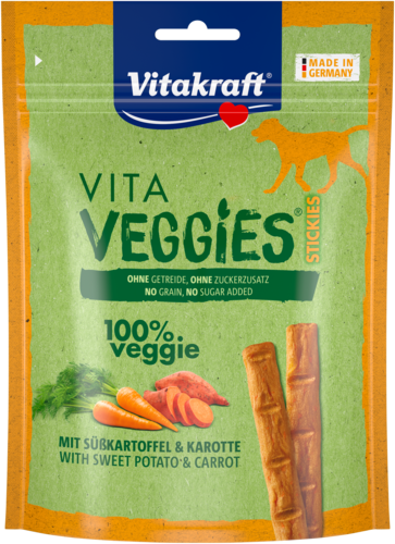 Les bâtonnets Vita Veggies® sont riches en légumes sains et fournissent le riche carotène de la carotte et de la patate douce. Ce snack à faible teneur en matières grasses est donc parfait comme alternative végétarienne pour gâter, récompenser ou simplement pour grignoter entre deux repas. Les bâtonnets sont sans céréales. Ainsi, même les chiens souffrant d'intolérances pourront en profiter sans souci.
