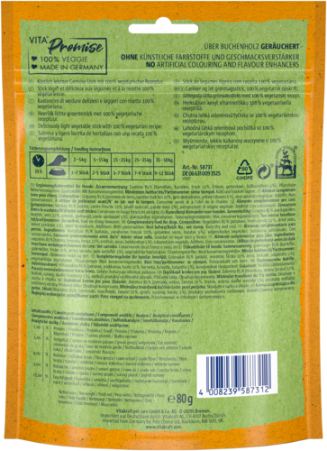 Vita Veggies® ne contient ni sucres ajoutés, ni exhausteurs de goût artificiels, ni colorants. De plus, ce snack aux légumes est délicieusement fumé au bois de hêtre, ce qui le rend encore plus délicieux ! 100 % végétarien signifie 100 % de plaisir. Une véritable merveille de la nature !
