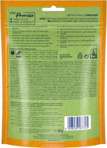 Ces délicieux bâtonnets Vita Veggies® sont riches en légumes et contiennent de précieuses protéines provenant du fromage. Les bâtonnets sont donc parfaits comme alternative végétarienne pour gâter, récompenser ou simplement pour grignoter. Les bâtonnets sont sans céréales. Ainsi, même les chiens souffrant d'intolérances pourront en profiter sans souci.