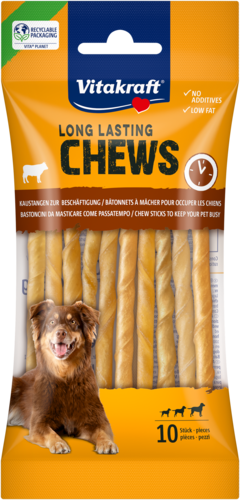 Votre chien s'attaque-t-il volontiers à vos chaussettes quand vous travaillez à la maison ? Divertissez votre petit filou avec les bâtonnets à mâcher de Vitakraft. Ils sont délicieusement torsadés et occuperont votre chien pendant que vous terminez de rédiger votre e-mail. Les bâtonnets à mâcher torsadés sont faits de 100 % de peau de bœuf séchée et torsadée. Grâce à la mastication prolongée, vous évitez l'ennui, mais votre chien peut aussi entraîner les muscles de sa mâchoire et entretenir sa dentition. Parfait, n’est-ce pas ?
