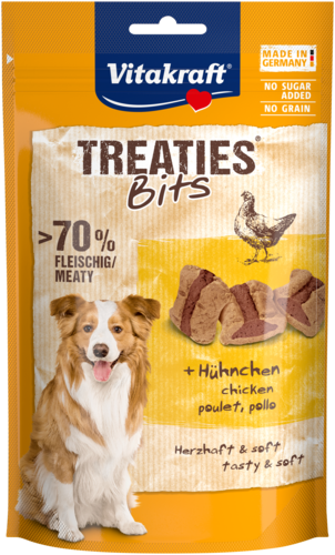 Vous cherchez un en-cas doux pour votre chien? Découvrez ensuite le poulet Vitakraft Treaties Bits. Vous gâterez votre quadrupède avec des coussinets doux au délicieux goût de poulet. Une friandise populaire à laquelle votre chien ne pourra pas résister !