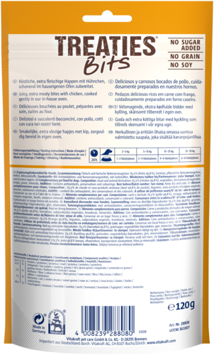Cet en-cas pour chiens a une teneur élevée en viande et une garniture délicieuse pour une expérience gustative inégalée. Treaties Bits est fabriqué sans céréales, sans soja et sans sucres ajoutés. En bref, un délicieux en-cas à base de viande qui ne manquera pas de faire remuer la queue de votre chien.