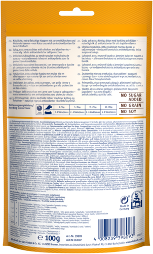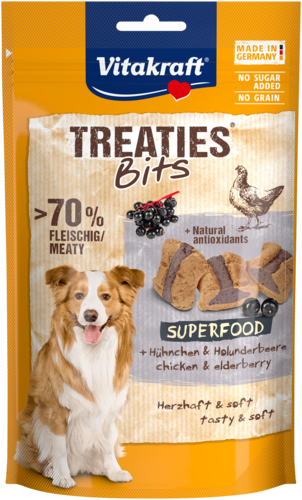 En outre, cet en-cas pour chiens contient un super aliment, à savoir des baies de sureau. Les baies de sureau sont naturellement riches en antioxydants. Les antioxydants aident à protéger les cellules de votre doerak. Ainsi, Vitakraft Treaties Bits n'est pas seulement savoureux mais aussi fonctionnel !