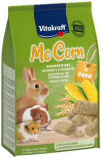 Vitakraft® Mc Corn, ce sont des bâtonnets à grignoter légers et croustillants à base de céréales mûries au soleil et de maïs doré, qui sont non seulement délicieux, mais qui apportent également de précieux nutriments à vos rongeurs.