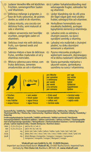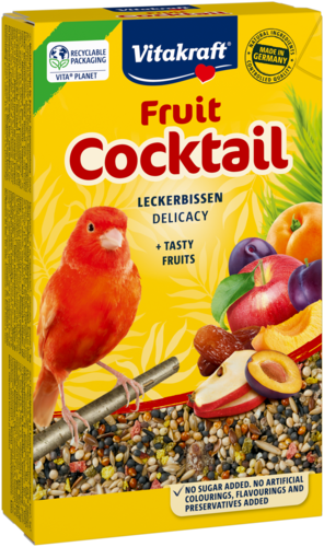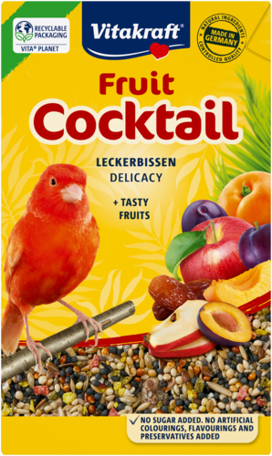 Le Frutti Cocktail pour canari est un délicieux mélange plaisir riche en vitamines et nutriments essentiels. Il apporte de la variété dans la ration de nourriture quotidienne du canari et se compose de savoureux fruits tels que des pommes, des prunes et des abricots ainsi que des graines mûries au soleil - véritable source saine d'énergie. Ces ingrédients sélectionnés avec soin font du Frutti Cocktail un aliment goûteux en complément de l'alimentation principale. Préparé selon une recette sans sucre, sans exhausteurs de goût, ni conservateurs.