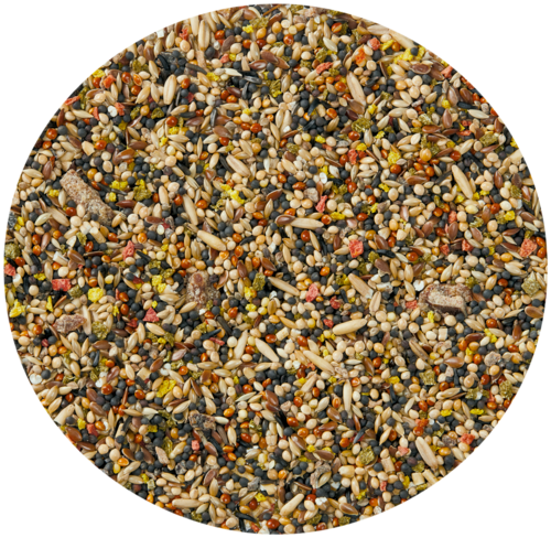 céréales, graines 45,0%, fruits 5,0%, huiles et graisses, oeufs et produits d'oeufs, substances minérales