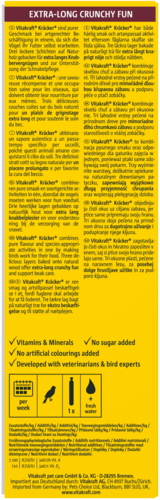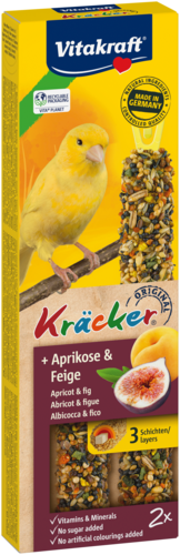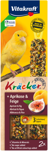 Le Kräcker® Vitakraft original est une friandise responsable aux graines, aux céréales, aux abricots et aux figues sur un bâton de bois naturel qui peut être picoré. Le Kräcker® a un goût délicieux et est cuit 3 fois pour bien fixer les ingrédients et permettre au canari de rester actif et se dépenser tout comme il le ferait dans la nature. Il stimule l'activité de l'oiseau et lui permet d'user son bec de façon naturelle. Le Kräcker® est adapté aux besoins nutritionnels des canaris. Contient des vitamines essentielles et est fabriqué selon une recette sans sucre.