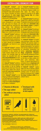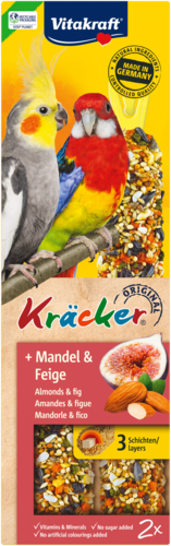Le Kräcker® Vitakraft original est une friandise responsable aux graines, aux céréales, aux amandes et aux figues sur un bâton de bois naturel qui peut être picoré. Le Kräcker® a un goût délicieux et est cuit 3 fois pour bien fixer les ingrédients et permettre à la grande perruche de rester active et se dépenser tout comme elle le ferait dans la nature. Il stimule l'activité de l'oiseau et lui permet d'user son bec de façon naturelle. Le Kräcker® est adapté aux besoins nutritionnels des grandes perruches. Contient des vitamines essentielles et est fabriqué selon une recette sans sucre.
