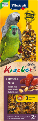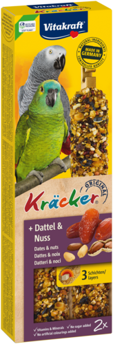 Le Kräcker® Vitakraft original est une friandise responsable aux céréales, aux graines, aux noix et aux dattes sur un bâton de bois naturel qui peut être picoré. Le Kräcker® a un goût délicieux et est cuit 3 fois pour bien fixer les ingrédients et permettre au perroquet de rester actif et se dépenser tout comme il le ferait dans la nature. Il stimule l'activité de l'oiseau et lui permet d'user son bec de façon naturelle. Le Kräcker® est adapté aux besoins nutritionnels des perroquets. Contient des vitamines essentielles et est fabriqué selon une recette sans sucre.