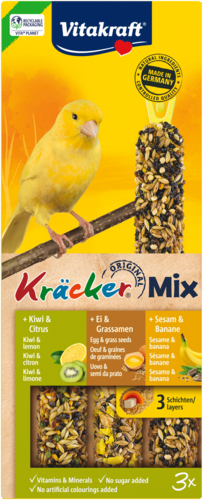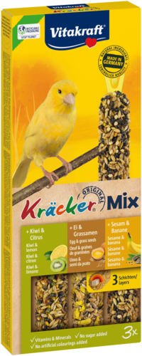 Le Kräcker® Trio Mix Vitakraft original est une friandise responsable composée de 3 Kräcker® assortis de 3 goûts différents aux oeufs, à la banane et au kiwi sur un bâton de bois naturel qui peut être picoré. Le Kräcker® a un goût délicieux et est cuit 3 fois pour bien fixer les ingrédients et permettre au canari de rester actif et se dépenser tout comme il le ferait dans la nature. Il stimule l'activité de l'oiseau et lui permet d'user son bec de façon naturelle. Le Kräcker® est adapté aux besoins nutritionnels des canaris et est riche en vitamines essentielles.