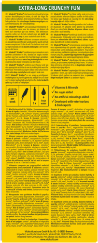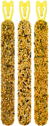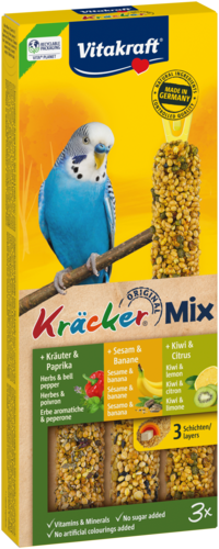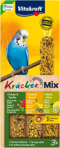 Le Kräcker® Trio Mix Vitakraft original est une friandise responsable composée de 3 Kräcker® assortis de 3 goûts différents à la banane, aux herbes et au kiwi sur un bâton de bois naturel qui peut être picoré. Le Kräcker® a un goût délicieux et est cuit 3 fois pour bien fixer les ingrédients et permettre à la perruche de rester active et se dépenser tout comme elle le ferait dans la nature. Il stimule l'activité de l'oiseau et lui permet d'user son bec de façon naturelle. Le Kräcker® est adapté aux besoins nutritionnels des perruches et est riche en vitamines essentielles.