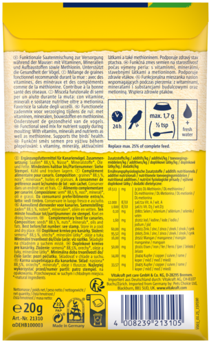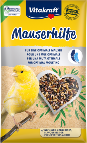 Mélange qui apporte aux canaris des nutriments essentiels, de la méthionine, des vitamines et substances minérales durant la mue. Aide mue qui contribue au bon déroulement de la mue et qui favorise la santé de l'oiseau. Le Mauserhilfe est fabriqué selon une recette sans sucre, sans colorants ni conservateurs.