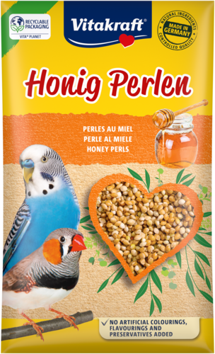 Les perles au miel sont un important complément alimentaire pour les perruches et les oiseaux exotiques. Friandise plaisir très populaire, idéale pour stimuler l'oiseau qui s'entraîne à parler et chanter. Mélange contenant du miel pur et différentes sortes de millet mûri au soleil. Enrichi en vitamines et substances minérales essentielles. Préparé sans colorants ni conservateurs.