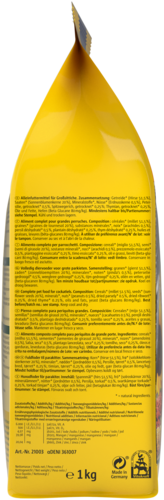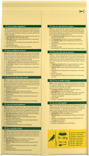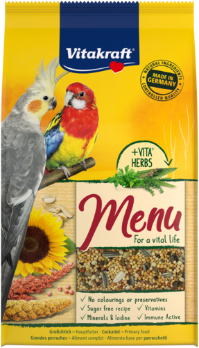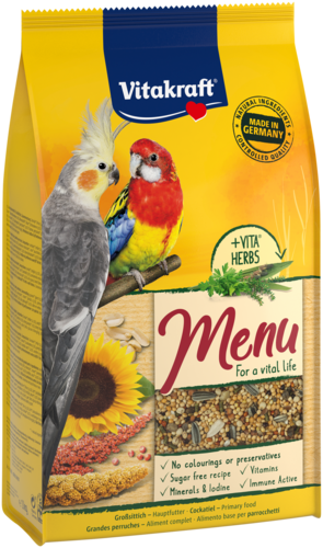 Le Menu Premium pour grandes perruches a été composé avec soin. Alimentation principale spécialement adaptée et équilibrée à base de graines de grande qualité, de noix et de céréales. Délicieux mélange qui contient tous les ingrédients dont les oiseaux ont besoin pour une vie en bonne santé. Les taux parfaitment adaptés de vitamines essentielles évitent les carences et favorisent le bien-être de la grande perruche. Nourriture enrichie en bêta-glucanes pour renforcer le système immunitaire de l'oiseau. Le Vital Complex iodé garantit un apport suffisant en iode, en substances minérales et en oligoéléments pour soutenir le métabolisme. L'équilibre optimal en calium et en phosphore contribue à entretenir la structure osseuse. Recette sans sucre, sans exhausteurs de goût, sans colorants ni conservateurs. Emballé dans un emballage fraîcheur refermable.