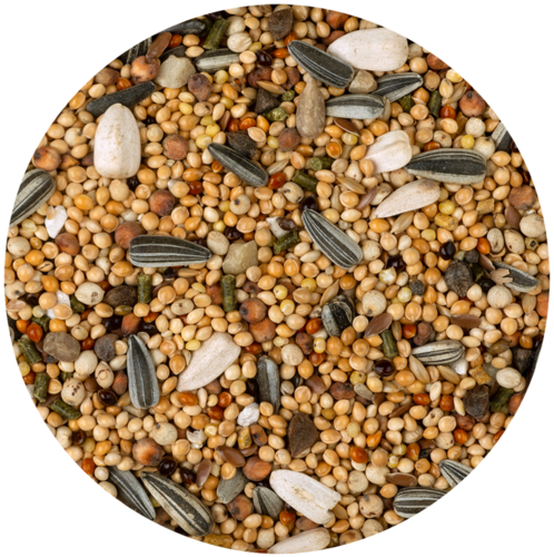 céréales (millet 52,2%), graines 26,7% (graines de tournesol 20,0%), substances minérales, noix (cacahuètes 0,5%), sous-produits d'origine végétale, miel 0,02%, huiles et graisses, levures (bêta-glucane 80mg/kg)