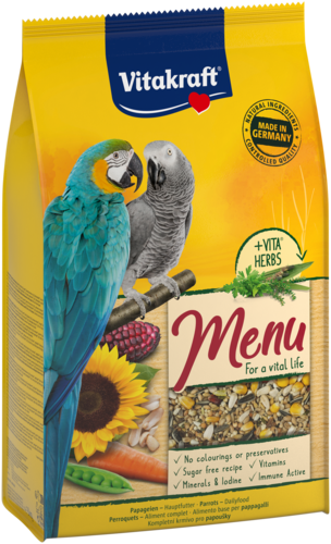 Le Menu Premium pour perroquets a été composé avec soin. Alimentation principale spécialement adaptée et équilibrée à base de graines de grande qualité, de céréales, de maïs rouge et de morceaux de carottes. Délicieux mélange qui contient tous les ingrédients dont les oiseaux ont besoin pour une vie en bonne santé. Les taux parfaitment adaptés de vitamines essentielles évitent les carences et favorisent le bien-être du perroquet. Nourriture enrichie en bêta-glucanes pour renforcer le système immunitaire de l'oiseau. Le Vital Complex iodé garantit un apport suffisant en iode, en substances minérales et en oligoéléments pour soutenir le métabolisme. L'équilibre optimal en calium et en phosphore contribue à entretenir la structure osseuse. Recette sans sucre, sans exhausteurs de goût, sans colorants ni conservateurs. Emballé dans un emballage fraîcheur refermable.