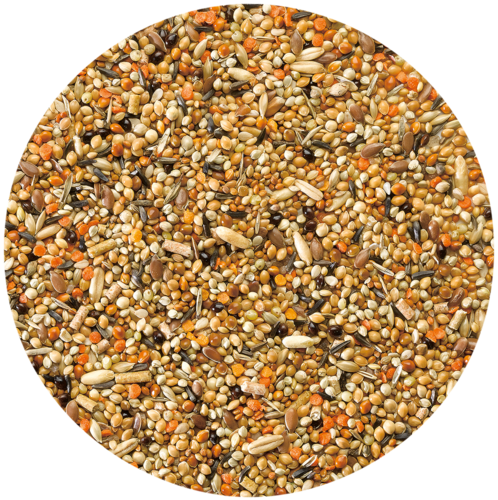 céréales (millet 63,6%, avoine 5,7%), graines (graine de lin 5,0%), substances minérales (gravier pour gésier 3,0%), huiles et graisses 1,0%, sous-produits d'origine végétale, miel, levures (bêta-glucane 100 mg/kg)