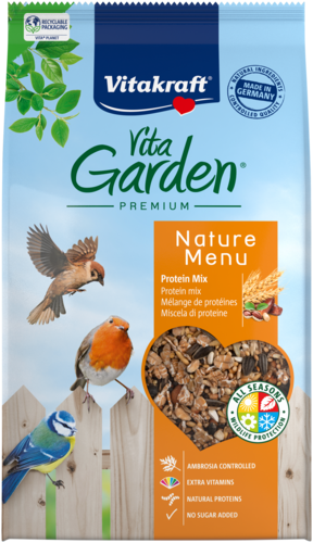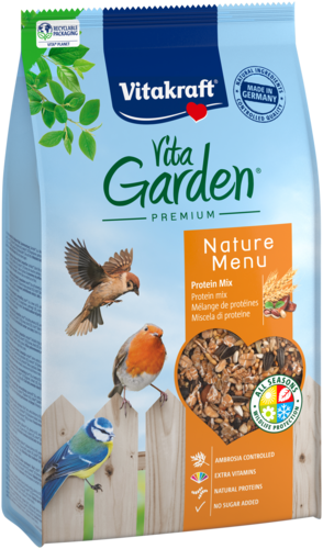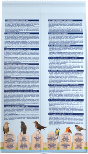 Le mélange de graines Vita Garden Protein Mix est un complément optimal à l'alimentation naturelle des oiseaux de jardin. Ce mélange de graines, de dattes, de raisins, de cacahuètes et de protéines animales contient des nutriments essentiels pour les oiseaux de jardin. A donner idéalement dans la mangeoire ou à répandre sur le sol. Recette sans sucre, sans colorants ni conservateurs. Des études scientifiques ont confirmé qu'un apport complémentaire de nourriture toute l'année permettait de préserver la variété des espèces d'oiseaux sauvages et contribuait activement à leur protection.