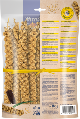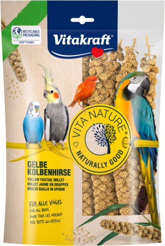 Le millet VITA NATURE Vitakraft est entièrement composé de millet jaune naturel. Le millet est récolté et séché avec soin. Parfait comme friandise saine pour les oiseaux d'ornement. Le millet stimule l'activité naturelle de l'oiseau qui doit picorer les graines de la branche. Facile à digérer, le millet offre un bon apport en vitamine B. Avec attache pratique pour suspendre les branches dans la cage.