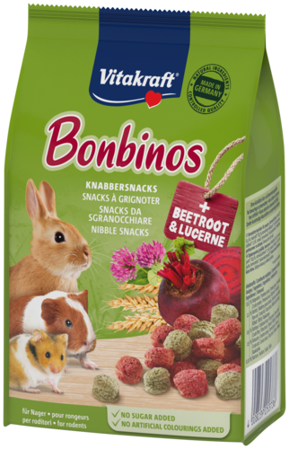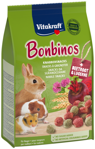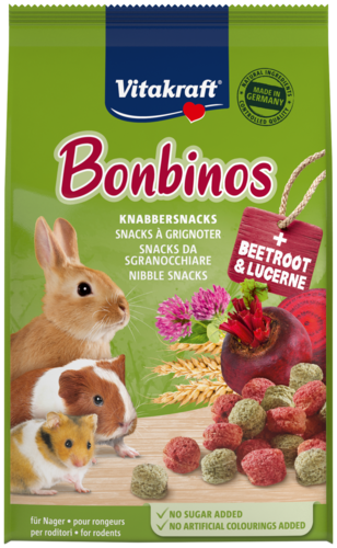 Vous cherchez une collation amusante à grignoter pour votre rongeur ou votre lapin ? Découvrez le Vitakraft Bonbinos. Des boules croustillantes à base de luzerne et de betterave qui roulent d'avant en arrière lorsqu'elles sont mangées, pour un plaisir ludique supplémentaire. Cet en-cas n'est pas seulement délicieux pour se faire dorloter, mais aussi pour les séances de jeu avec vos fesses à grignoter. Les Bonbinos sont aussi très bons pour se nourrir à l'aveuglette.