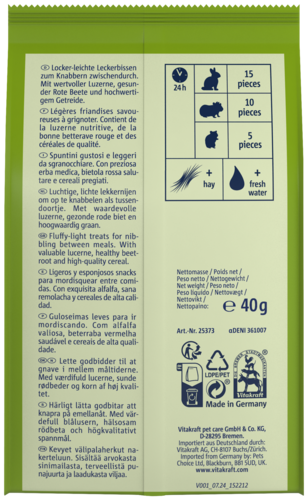 Cet en-cas croquant convient à tous les rongeurs et lapins. Cette friandise est préparée sans sucres ajoutés, sans colorants artificiels et sans conservateurs. Les boules sont emballées par Aroma Fresh, de sorte que les bouchées restent bien croustillantes.