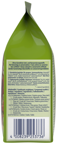 céréales (86,5%), sous-produits d'origine végétale (7,5% luzerne), légumes (betterave rouge déshydratée 2,5%), substances minérales