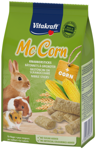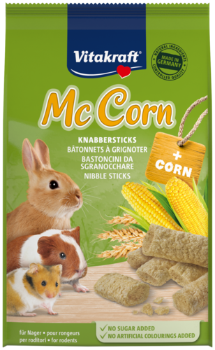 Vous cherchez un goûter savoureux pour les lapins ou les rongeurs ? Découvrez le Mc Maïs de Vitakraft. De savoureux bâtonnets à grignoter à base de céréales mûries au soleil et de délicieux maïs doré. Non seulement des ingrédients irrésistibles, mais aussi riches en nutriments. Pensez aux vitamines A et D. Ce casse-croûte pour rongeurs contient également les minéraux suivants : sélénium, fer, cuivre, iode, manganèse et zinc. La santé de votre champion du grignotage est donc bien soutenue.