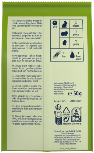 Les bâtonnets mesurent environ 6 cm de long et sont idéaux pour nourrir de manière ludique le rongeur ou le lapin. Il n'est donc pas seulement agréable de se faire dorloter, mais aussi de jouer et de s'entraîner.