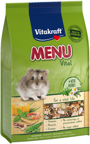 Le Menu Premium Vital pour hamsters nains est composé de céréales de grande qualité, de délicieuses graines et de noix croustillantes. Ce mélange équilibré que les hamsters nains adorent contient tous les nutriments essentiels dont les hamsters nains ont besoin pour une vie en bonne santé. Cette nourriture contient aussi des vitamines essentielles, des substances minérales, des oligoéléments et des protéines très qualitatives qui couvrent les besoins énergétiques importants des hamsters nains. Aliment également enrichi en acide linoléique, en zinc et en biotine pour un pelage sain et brillant. Recette sans sucre, sans colorants, sans exhausteurs de goût ni conservateurs. Emballé dans un emballage fraîcheur refermable.