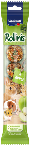 Les Rollinis à la pomme et aux céréales sont non seulement un snack responsable mais aussi un jeu actif pour tous les rongeurs et les lapins nains. Les Rollinis peuvent être placés sur le sol. L'animal doit alors attraper ces petites balles qui roulent pour pouvoir les manger. Délicieuse friandise amusante fabriquée selon une recette sans sucre ni conservateurs. Snack emballé dans un emballage fraîcheur Aroma Fresh pour que les Rollinis restent croustillants.