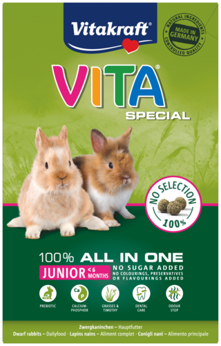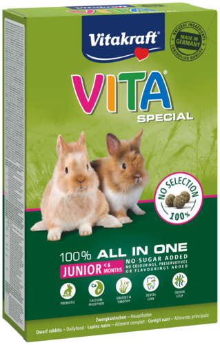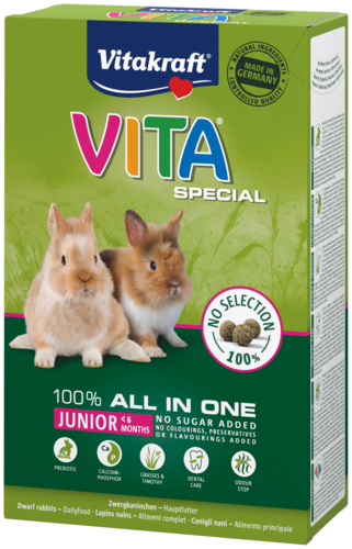 Lorsque vous avez un nouveau membre de la famille tout doux, vous voulez bien sûr que votre petit bout de chou ait un départ sain. Vous voulez vous assurer que votre lapin reçoit tous les nutriments dont il a besoin pour bien grandir et qu'il ne manifeste pas un comportement alimentaire sélectif. Nous le comprenons parfaitement ! C'est pourquoi Vitakraft offre Vita Special junior pour lapins. Une croquette tout-en-un qui contient <strong>toutes les vitamines et tous les minéraux essentiels</strong> pour donner à votre lapin un bon départ. Grâce à des ingrédients de valeur tels que le <strong>foin Timothy digestible</strong>, chaque aliment contient tout le goût de la nature et, en même temps, tous les nutriments importants et les éléments constitutifs d'une vie saine et active.