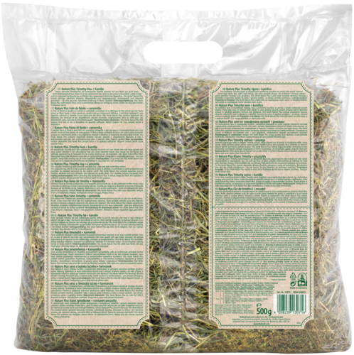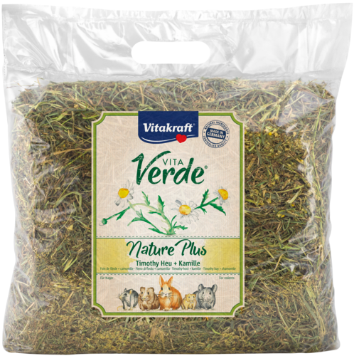 Il est très important de toujours mettre du foin à disposition des rongeurs et des lapins nains. Le foin est riche en fibres brutes qui contribuent au bien-être de l'animal. Ce taux élevé de cellulose brute favorise la digestion et stimule la mastication qui contribue à l'usure dentaire des lapins et rongeurs. Le foin Vita Verde® camomille est enrichi en savoureuse camomille reconnue pour ses propriétés apaisantes de l'estomac et des intestins. Produit naturel séché au soleil pour que les vitamines et substances minérales puissent autant que possible rester intactes.