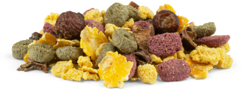 céréales, fruits 22,8% (caroube déshydratée 10,0%, banane déshydratée 4,2%, papaye 2,3%), sous-produits d'origine végétale, légumes, huiles et graisses, sucre, substances minérales, levure