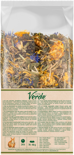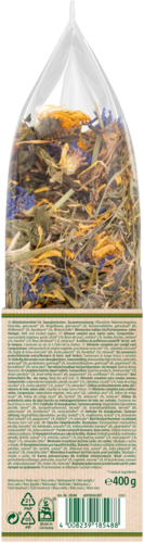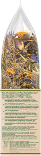 sous-produits d'origine végétale, fleur de souci 5,0%, persil déshydraté 5,0%, bleuet 1,0%, feuille d'ortie 4,0%, menthe poivrée 3,0%, substances minérales