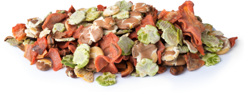 <li>contient des flocons de haricots, des flocons de pois et des flocons de carottes</li>