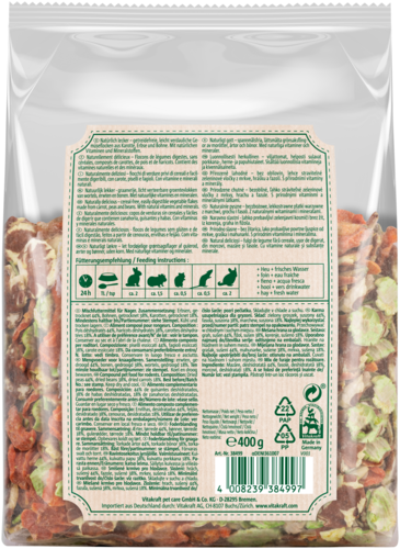 Vous voulez surprendre votre rongeur avec des flocons festifs sans sucres ajoutés ? Alors faites le bonheur de votre animal avec les flocons Vita Verde Nature de Vitakraft. Les flocons Vita Verde Nature avec légumes sont fabriqués à partir d'ingrédients naturels purs et peuvent être donnés comme collation ou avec l'alimentation principale. Ce snack salé offre une variété de flocons de haricots, de pois et de carottes qui sont irrésistiblement délicieux. Le snack pour rongeurs est facile à digérer et contient des vitamines et des minéraux naturels. Cette friandise ne contient ni céréales ni sucres ajoutés. En outre, les flocons Vita Verde Nature sont exempts de colorants, d'exhausteurs de goût et de conservateurs artificiels.