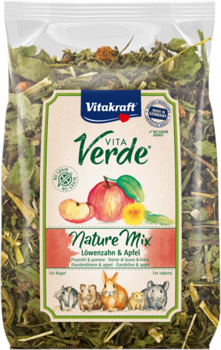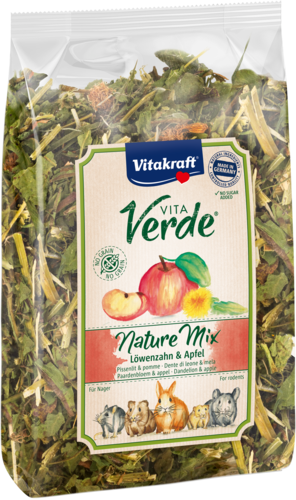 Votre rongeur ou votre lapin ne se lasse pas de votre potager ? Alors gâtez votre gourmand avec les saveurs naturelles de Vita Verde Nature Mix de Vitakraft. Un mélange de divers ingrédients naturels séchés, comme la pomme et le pissenlit, pour un plaisir de grignotage. La pomme et le pissenlit sont riches en protéines naturelles qui, entre autres, reconstituent les réserves d'énergie du membre de votre famille. Le snack pour rongeurs ne contient pas de céréales et constitue un en-cas sain entre les repas. Grâce aux ingrédients naturels de cette savoureuse friandise, votre animal bénéficie également de vitamines naturelles. En outre, le mélange Vita Verde Nature Mix est exempt de sucres ajoutés, de colorants artificiels et de conservateurs.