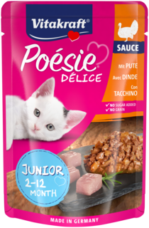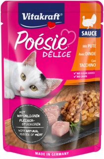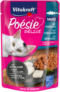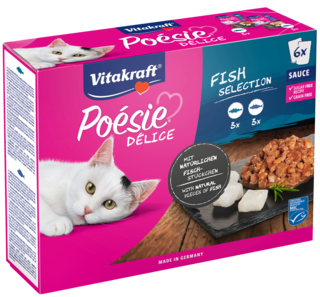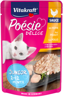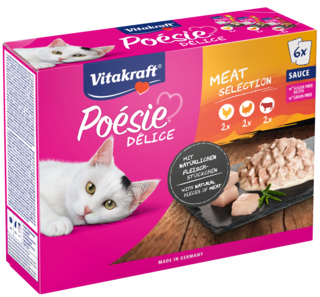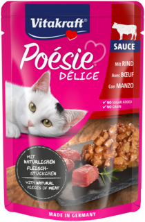 De producten van Vitakraft® Poésie® DÉLICE maken het smaakverschil met hun natuurlijke stukjes vlees of vis van hoge kwaliteit.