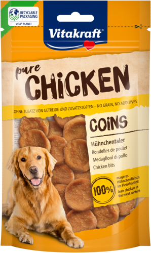Wil je jouw hond 'betalen' met een pure en lekkere snack? De Vitakraft® Chicken Coins zijn de perfecte beloning voor onderweg of gewoon tussendoor. Dankzij hun ronde vorm en stevige structuur verkruimelen ze niet in je tas en zijn ze ideaal als trainingssnack!