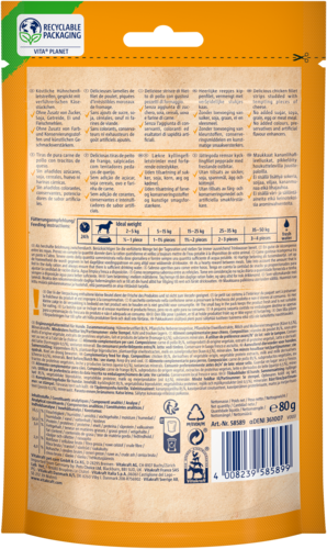 Kan jouw hond geen genoeg krijgen van vlees én kaas? Trakteer hem op Vitakraft® Pure Chicken met kaas – heerlijke malse kipfiletreepjes met verleidelijke stukjes kaas. Een onweerstaanbare combinatie die zelfs de meest kieskeurige viervoeter laat watertanden!