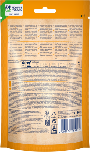 Is jouw hond een echte vleesliefhebber? Dan zal hij smullen van de Pure Duck eendenreepjes van Vitakraft®! Deze heerlijke snack is puur natuur en bevat 100% mager eendenvlees – zonder toevoegingen zoals suiker, kunstmatige kleurstoffen, smaakversterkers en conserveringsmiddelen. Een echte traktatie voor je trouwe viervoeter! Dankzij de stevige structuur zorgen de reepjes voor extra kauwplezier en zijn ze ideaal als beloning of tussendoortje. Bovendien zijn ze vrij van granen, soja, ei en vleesmeel, waardoor ze ook geschikt zijn voor gevoelige honden. Door de hersluitbare, duurzame verpakking blijven de snacks lekker vers. Jouw hond zal gegarandeerd kwispelen van geluk!