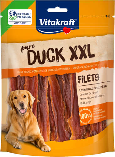 Snel naar de keuken rennen zodra er vlees wordt bereid – herkenbaar? Verwen je meatlover dan met de Pure Duck XXL van Vitakraft®! Deze extra grote eendenreepjes zijn puur natuur en volledig vrij van toegevoegde suikers, kunstmatige kleurstoffen, smaakversterkers en conserveringsmiddelen. Puur en intens genieten dus!